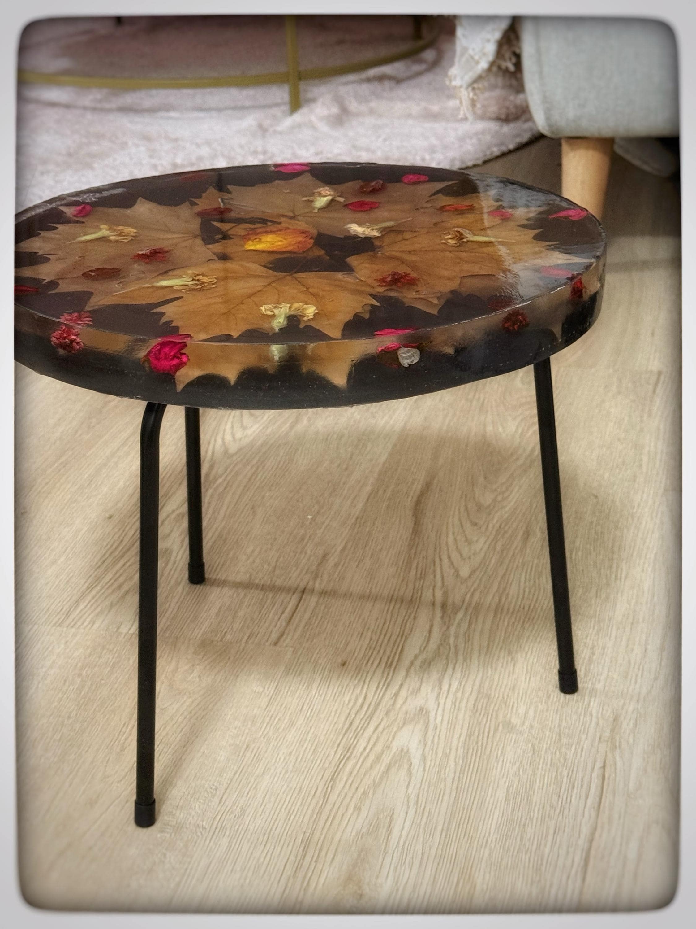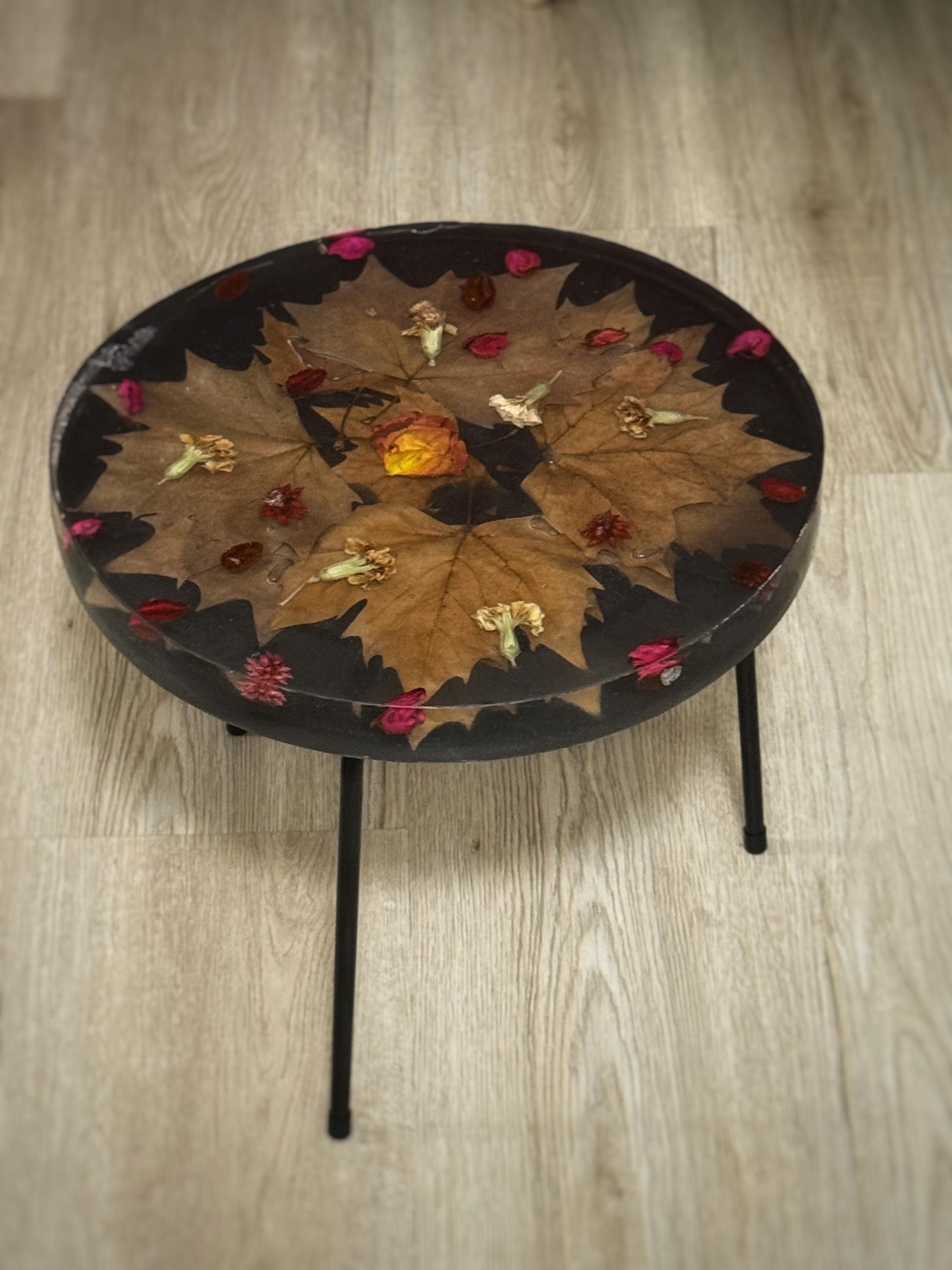 Resin side table with autumn leaves